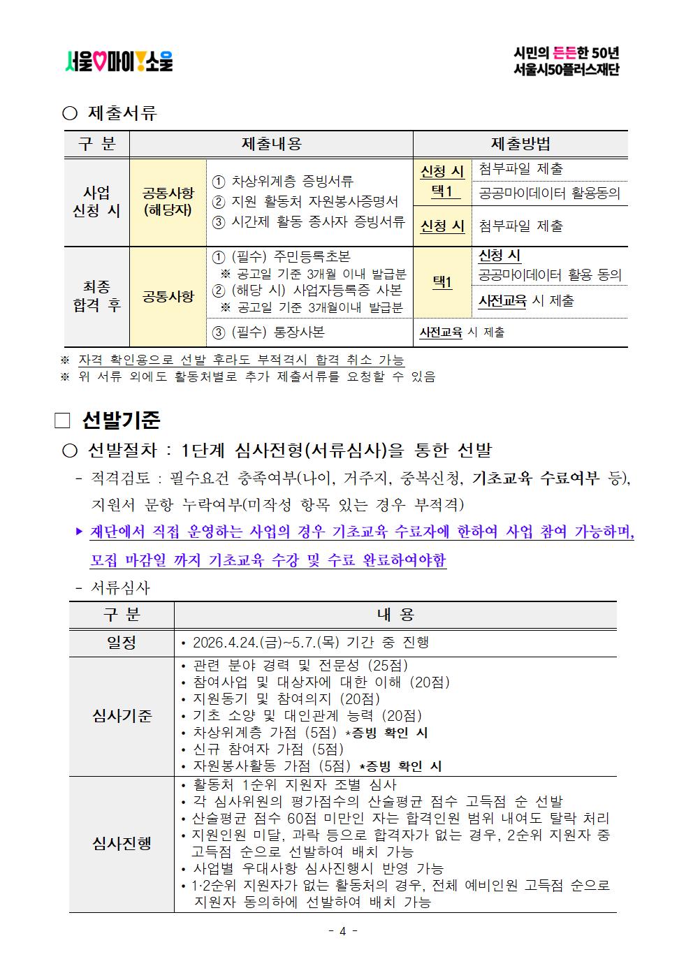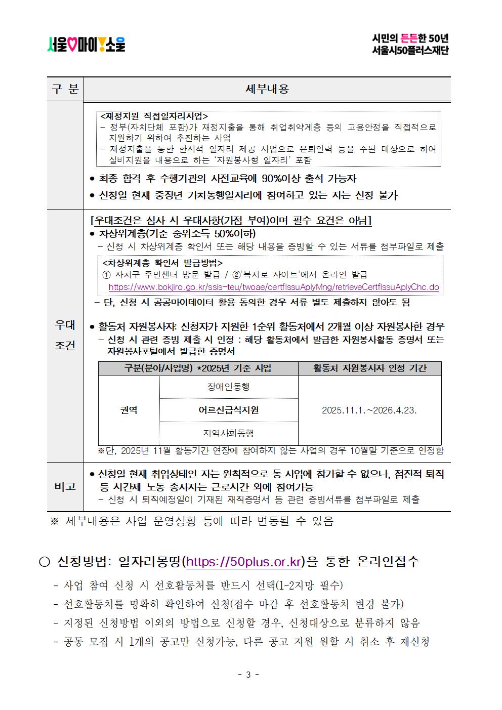 1. 신규 사업참여자 2. 활동처 자원봉사자: 신청자가 지원한 1순위 활동처에서 2025년 11월 1일~2026년 4월 23일 사이 2개월 이상 자원봉사 이력이 있는 자 3. 차상위계층(기준 중위소득 50%이하)인 자 ※ 1~3번 사항의 우대조건은 심사 시 우대사항이며, 필수요건은 아님 ※ 2~3번 사항은 온라인 신청 시 증빙서류 첨부 필수, 증빙서류 미첨부 시 가점 미부여