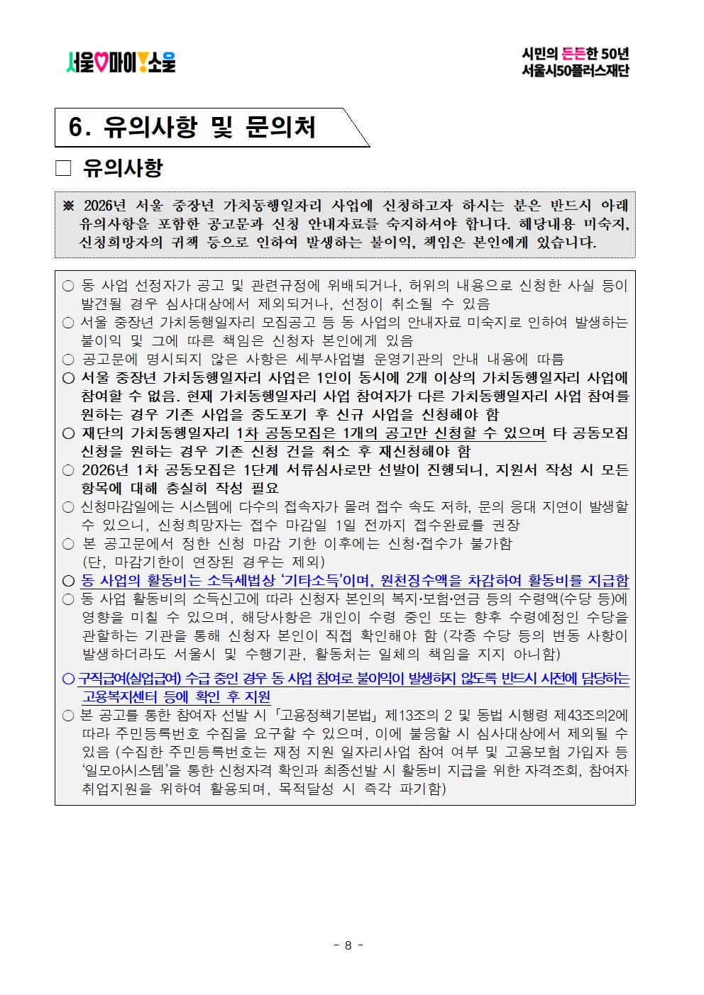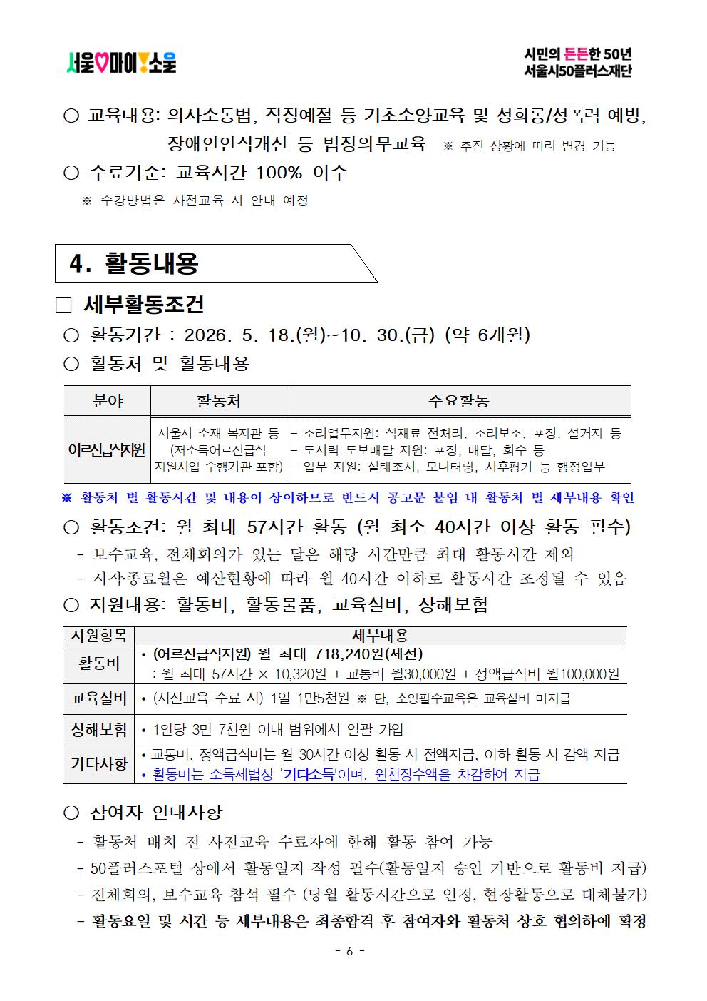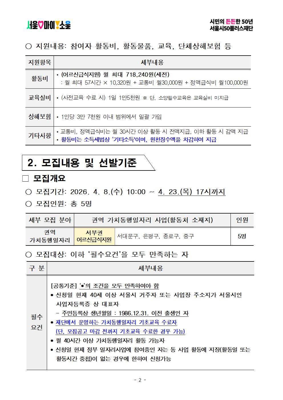 • 40세 이상(1986.12.31.이전 출생자, 차상위 계층도 동일)인 자 중 주민등록상 서울시 거주자 또는 사업장 주소지가 서울시인 사업자등록증 상 대표자 • 월 활동시간(57시간) 중 70%(40시간)이상 활동이 가능한 자 • 모집공고 최종합격 후 참여자 사전교육 수료(90% 이상), 소양필수교육 수료(100%) 가능한 자 • 모집공고 마감일 전까지 재단에서 운영하는 가치동행일자리 기초교육 수료한 자