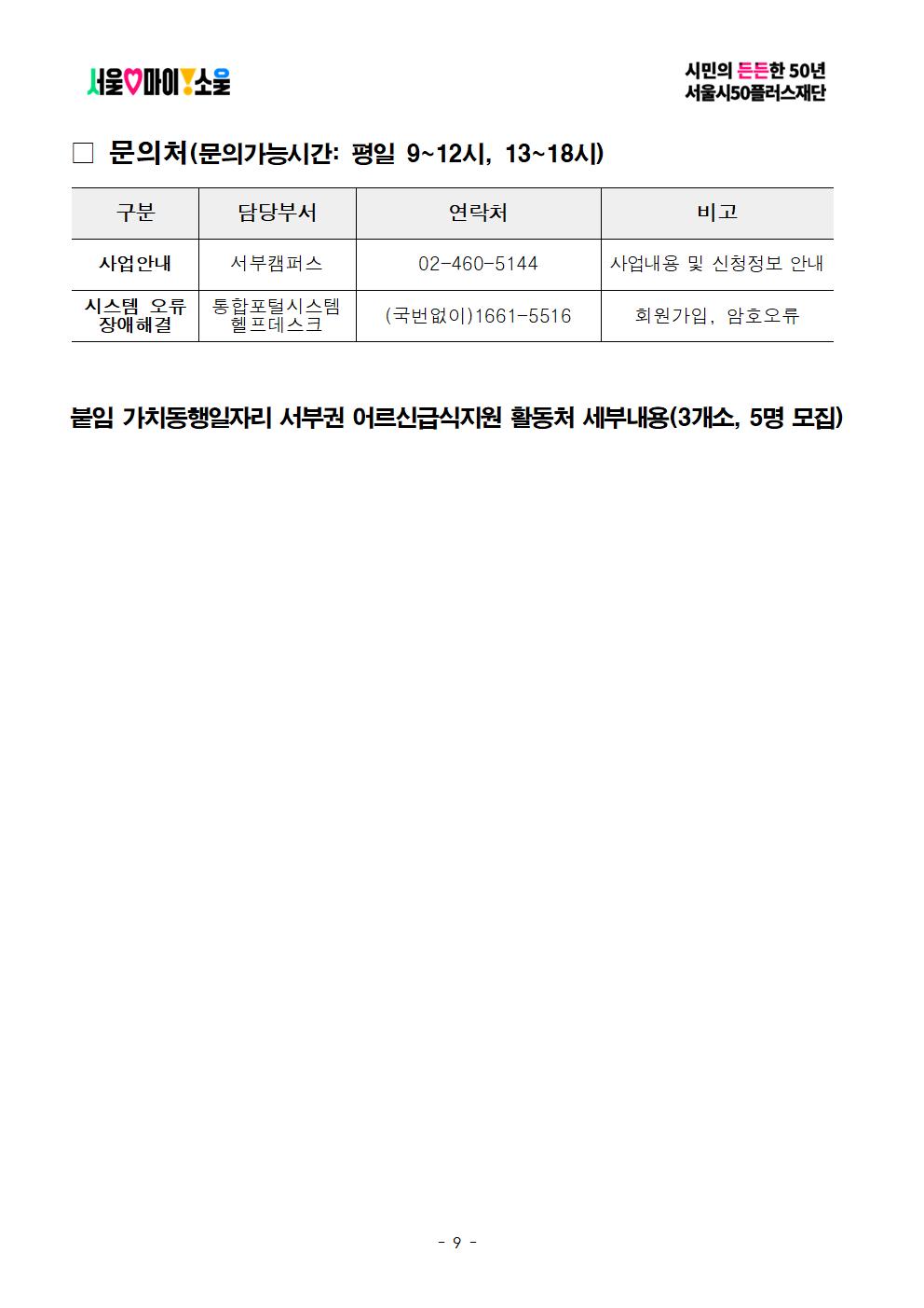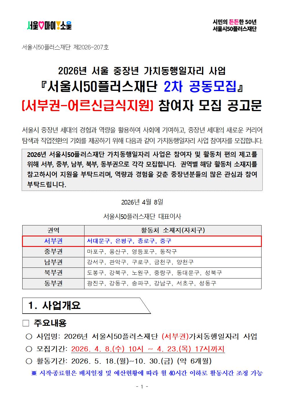 서울시50플러스재단 서부권 어르신급식지원(2차 공동모집)