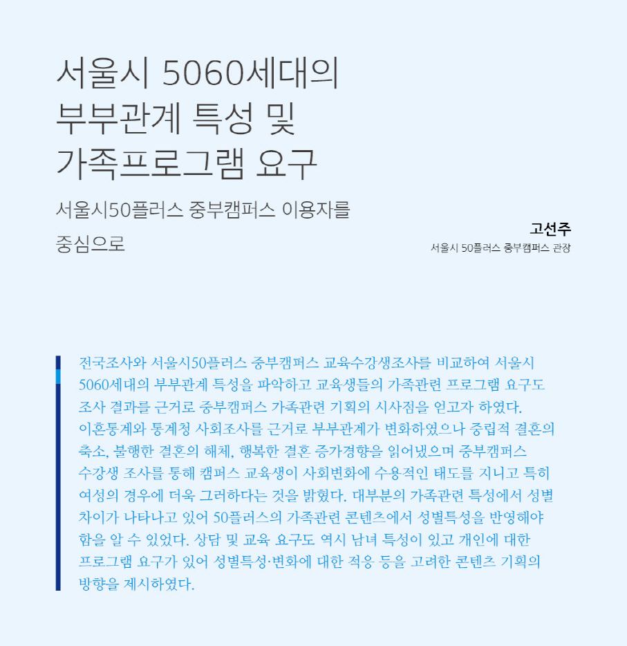 그러나 실제 캠퍼스를 이용하는 5060의 부부관계 특성이 어떠한가에 본격적인 관심을 가져본 적이 없다. 가족과 관련된 조사가 통계청 사회조사로 이루어지나 해당 조사는 서울이라는 지역과 연령, 두 변인을 동시에 고려하기 어렵고 또한 일부 조사만 이루어져서 부부관계 특성에 대한 전반적인 파악이 힘들다. 가족실태조사의 경우 지역의 대표성이 문제가 되고, 서울서베이에서 조사되는 내용은 부부관계 특성을 규명하기 어려운 내용들이라서 50플러스 캠퍼스를 이용하는 사람들의 특성은 아직까지 분석된 바 없다. 분절된 업무 중심의 접근을 시도하는 중앙정부와 달리 서울시는 50플러스 캠퍼스라는 공간 플랫폼에서 당사자 주도와 커뮤니티라는 공동체를 통한 통합적 접근을 하고 있다. 이러한 접근에서 총체적으로 이뤄지는 인생재설계에서 가족 영역은 매우 중요한 영역이 된다. 설립 전 수요조사(서울시, 2015)에서 가족은 중요하게 부각되었지만 실제 캠퍼스 운영 이후의 이용자 조사는 프로그램 참여자의 만족도 이외에는 조사한 바 없다. 가족 영역의 가치나 태도는 성별 특성이 매우 중요한 변인이 될 수 있다. 은퇴 시기까지 다른 삶의 경로를 경험해 온 남녀를 부부라는 이름으로 하나의 범주로 접근하는 것은 오해일 수 있다. 동일한 부부관련 프로그램의 해석에도 성별 특성에 따라 차이가 있을 수밖에 없는 것이다.