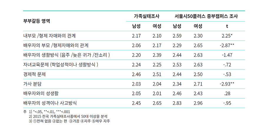 부부갈등 영역에서 가족실태조사와 중부캠퍼스 교육생 조사를 비교할 때 전반적으로 중부캠퍼스 이용자들의 부부갈등 수준이 더 높은 편이다. 통계적으로 차이를 확인하기는 어려우나 대략 경향을 살펴보면 전반적으로 경제적 문제를 제외한 모든 영역에서 전국 조사와 차이가 있는 것으로 보인다. 전국 조사와 서울시50플러스 중부캠퍼스 조사를 비교시 남녀에 따라 갈등 영역이 다르다는 것도 흥미롭다. 여성의 경우 전국과 중부캠퍼스의 차이가 가장 큰 영역은 가사분담 영역이다. 남성들의 경우 가사분담에 관한 갈등이 없는 편이라고 응답한 반면 여성들은 남성들보다 더 자주 갈등을 겪는다고 응답하고 있다. 다음으로는 배우자의 부모·형제자매와의 관계, 소위 시댁과의 갈등이 전국 조사보다 서울시50플러스 중부캠퍼스 조사가 더 높게 나타난다. 반면 남성들에게 전국 조사와 서울시50플러스 중부캠퍼스 조사의 차이가 큰 항목은 배우자의 성격이나 사고방식, 본인부모·형제와의 관계, 배우자와의 성생활 영역이다. 전국의 50대 이상 부부보다 중부캠퍼스 이용자들의 부부갈등이 남녀에 따라 어떻게 다른지를 엿볼 수 있는 문항들이다. 서울시50플러스 중부캠퍼스 조사의 경우 부부갈등이 가장 높은 영역은 남녀 모두 배우자의 성격이나 사고방식이었다. 다음으로 여성은 가사분담, 남성은 배우자의 생활방식을 갈등영역으로 인지하고 있었다. 남녀 간에도 차이가 있어서 내부모형제와의 관계는 남성들이 인지하는 갈등수준이 더 높은 반면 여성들은 배우자의 부모·형제자매와의 관계 그리고 가사분담에서 남성들보다 더 높은 갈등수준을 겪고 있었다. 남성의 부모가 여성의 배우자 부모임을 고려한다면 5060들에게 남성 부모와의 관계는 아직까지 갈등수준이 높은 관계임을 알 수 있다.