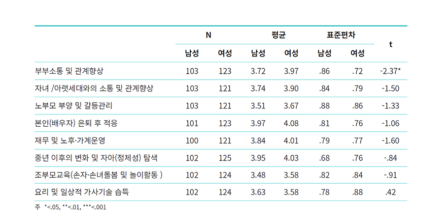 중부캠퍼스 교육생들의 가족교육 프로그램에 대한 요구도는 4점 내외로 전반적으로 프로그램의 필요성을 인지하고 있었고, 여성의 경우에 부부소통 및 관계 향상 영역에서 남성보다 요구 수준이 더 높았다. 남성의 경우 가장 요구도가 높은 것은 중년 이후 변화 및 자아정체성 탐색 분야였고 여성은 본인(배우자) 은퇴 후 적응, 재무 및 노후가계 운영, 중년이후 변화 및 자아(정체성)탐색 분야가 높은 편이다. 남녀 모두 조부모 교육에 대한 요구가 가장 낮았으며 요리와 일상기술의 경우도 다른 교육 영역보다 낮은 편이었다. 전반적으로 남녀 모두 가장 요구가 많은 것은 은퇴 후 적응과 중년이후의 변화 영역이다. 다음이 부부관계와 자녀세대와의 소통 및 관계 향상 영역이라고 볼 수 있을 것이다.