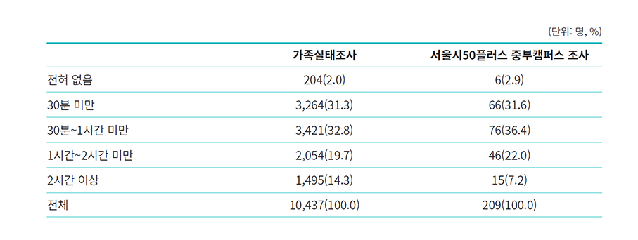 전국적으로 실시된 가족실태조사와 비교시 대체로 중부캠퍼스 이용자들의 대화시간이 전국 평균보다 약간 적은 것으로 보이나 표본규모에서 큰 차이가 있어 단언하기는 어렵다. 중요한 것은 중부캠퍼스 이용자들의 34.5%는 하루 평균 부부 대화시간이 30분 미만으로 길지 않다는 점이다. 중년기 이후 부부관계의 질에서 소통과 평등의 중요성을 감안한다면, 향후 대화시간을 늘리려는 노력이 필요하다는 것을 알 수 있다. 그러나 서로 소통하는 방법을 모르는 경우 무작정 절대적 시간의 양을 늘리는 것은 관계 향상에 도움이 되지 않을 수 있으므로 소통하는 방법과 상호이해에 대한 교육이 우선되어야 할 것이다.