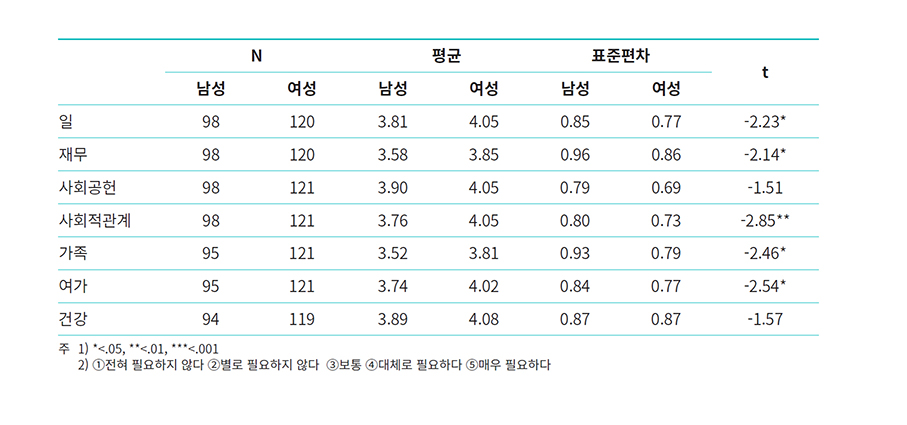 중부캠퍼스 이용자들의 상담 요구는 3점 중반 대에서 4점 초반대로 대체로 필요하다고 요구하는 편이다. 성별에 상관없이 모두 대체로 필요하다는 데에 동의하고 있으며 특히 여성들의 상담요구가 남성보다 더 높은 편이다. 여성들의 경우 가족과 재무를 제외한 일, 사회공헌, 사회적 관계, 여가, 건강 등 5대 영역에서 평균 4점을 넘는 점수를 보여 상대적인 상담요구가 높았다. 남성들은 대체로 3점 중반과 후반대로 여성들보다 요구도 자체는 좀 낮게 나타났으며 특히 일, 재무, 사회적 관계, 가족, 여가 영역에서 성별 차이가 통계적으로도 유의미하게 나타났다. 흥미로운 것은 남녀 모두 가족상담보다 사회적 관계에 대한 상담요구가 더 높다는 것이다. 이는 앞서 살펴본 전반적인 황혼이혼 증가, 졸혼현상, 부부갈등 등을 고려할 때 관계의 확대안과 확장을 엿볼 수 있는 부분이다.