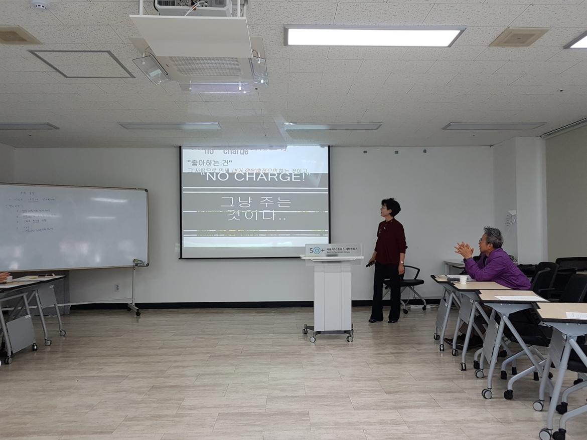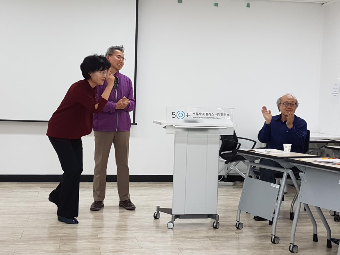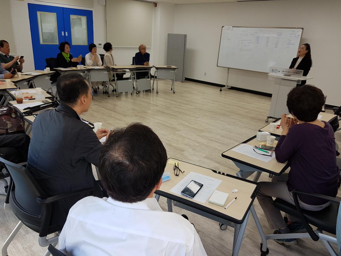 휴식시간이 되어 정선택 선생님께 짧은 인터뷰를 요청 드려 60+시니어강사협회가 탄생하게 된 배경을 들을 수 있었다. 작년 9월, 서울시50플러스재단과 한국노인인력개발원이 함께한 <시니어강사양성교육 기본과정>에서 처음 만났다고 한다. 이 과정은 역량과 경험이 있는 시니어를 대상으로 어르신일자리 참여자 교육을 위한 강사를 양성하는 것.