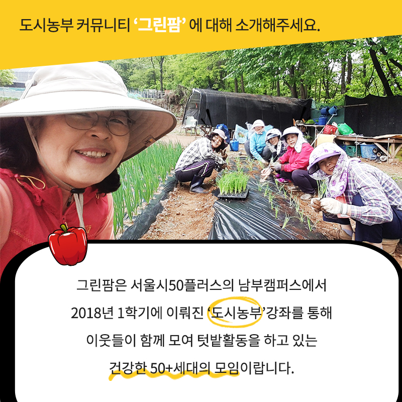'그린팜'은 서울시50플러스의 남부캠퍼스에서 2018년 1학기에 이뤄진 ‘도시농부’강좌를 통해