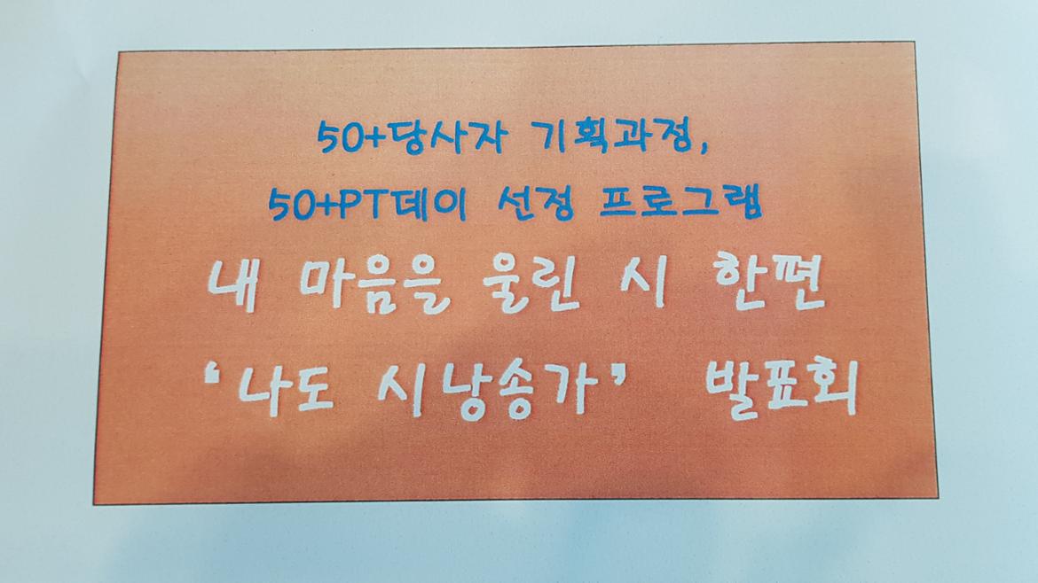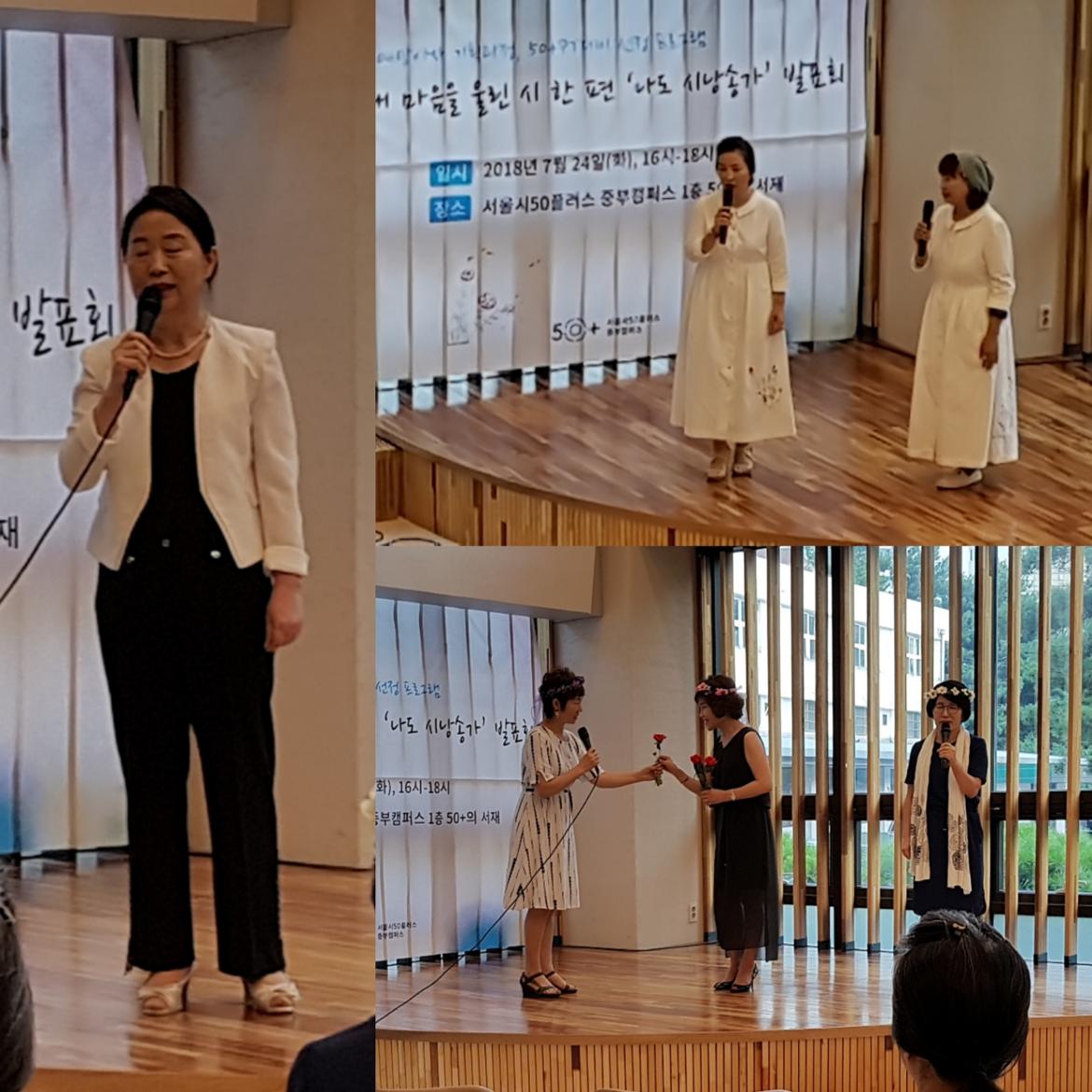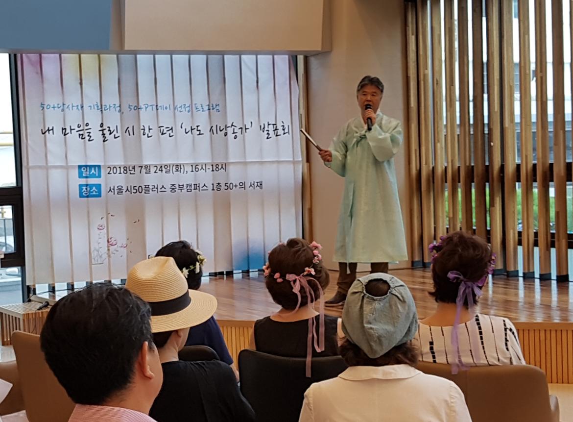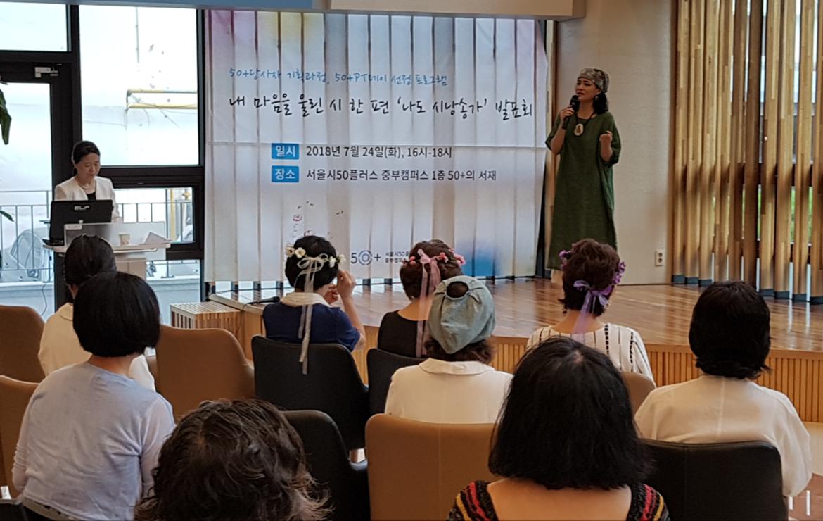 지난 7월 24일 서울시50플러스 중부캠퍼스에서는 도종환 님의 시 '흔들리며 피는 꽃'이 송숙경 님의 낭랑한 목소리로 낭송되었다. 그동안 앞만 보며 살아온 50+세대들의 메마른 감성이 촉촉이 적셔지는 순간이었다. 지난 7월 3일부터 내 마음을 울린 시 한편 <나도 시낭송가> 강좌를 들은 수강생들이 이날 발표회를 가진 것이다. 강좌를 수강하면서 배운 솜씨를 발휘하는 시 낭송이 시작되자, 50+세대들의 마음도 모처럼 조용히 흔들리기 시작했다.