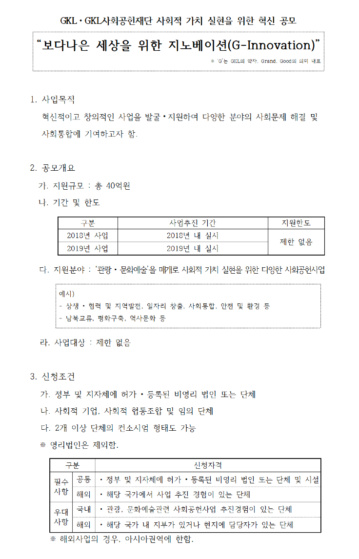 문화체육관광부 산하 비영리 재단법인인 GKL사회공헌재단에서 사회문제 해결을 위한 혁신적인 사업 아이디어를 발굴하고 지원하기 위해 사회공헌 사업 아이디어를 공모합니다.