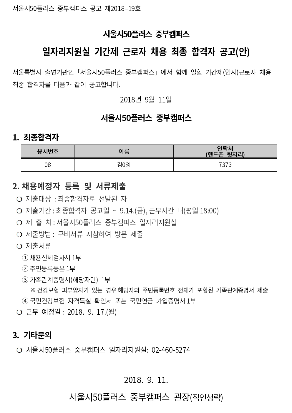 [중부]일자리지원실 기간제 근로자 채용 최종 합격자 공고