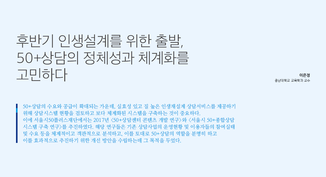 이처럼 50+상담의 수요지형과 공급지형이 확대되는 가운데, 시민들에게 보다 실효성 있고 질 높은 인생재설계 상담서비스를 제공하기 위해서는 현재의 상담시스템 현황을 검토하고 보다 체계화된 시스템을 구축하는 것이 중요하다. 이에 서울시50플러스재단에서는 2017년 50+상담 정책 및 사업의 체계화를 위한 연구들을 추진하였다. 하나는 상담의 표준적인 콘텐츠를 개발하고 정립하기 위한 <50+상담센터 콘텐츠 개발 연구>였으며, 다른 하나는 상담시스템을 체계적으로 구축하기 위한 <서울시 50+종합상담 시스템 구축 연구>였다. 해당 연구들은 기존 상담사업의 운영 현황 및 이용자들의 참여실태 및 수요 등을 체계적이고 객관적으로 분석을 하고, 이를 토대로 50+상담의 역할을 분명히 하고 이를 효과적으로 추진하기 위한 개선 방안을 수립하는데 그 목적을 두었다.