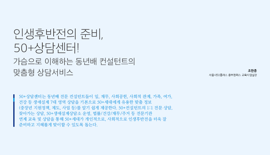 50+상담센터는 동년배 전문 컨설턴트들이 일, 재무, 사회공헌, 사회적 관계, 가족, 여가, 건강 등 생애설계 7대 영역 상담을 기본으로 50+세대에게 유용한 맞춤 정보(중장년 지원정책, 제도, 사업 등)를 알기 쉽게 제공한다. 50+컨설턴트의 1:1 전문 상담, 찾아가는 상담, 50+생애설계상담소 운영, 법률/건강/재무/주거 등 전문기관 연계 교육 및 상담을 통해 50+세대가 개인적으로, 사회적으로 인생후반전을 더욱 잘 준비하고 지혜롭게 맞이할 수 있도록 돕는다.