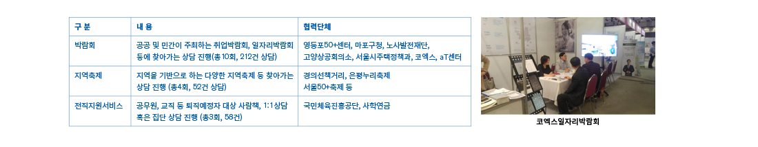 일자리박람회, 지역축제, 전직지원 교육서비스 등을 통해 현장을 직접 찾아가서 상담을 한다. 2017년도에 총17회, 322건을 상담했으며 찾아가는 상담은 점점 중요해지고 있고 확대될 것이다.