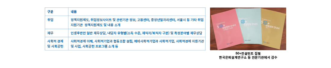 뿐만 아니라, 활발하게 활동하고 있는 50+컨설턴트가 참여한 상담 절차(상담준비-진행-마무리-기록)를 정리한 <상담자의 책>, 취업, 창업, 사회적 경제 및 사회공헌에 대한 지식, 정책, 제도를 담은 <50+상담정보안내서>는 내담자들이 보다 체계적이고 시의적절한 상담을 받는데 실질적인 도움이 된다.