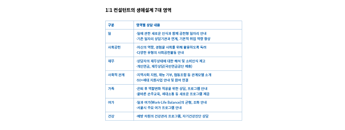 생애설계 7대 영역과 관련하여 전문 상담과 컨설팅을 받을 수 있다. 내가 원하는 라이프 스타일, 인생 후반기에 꼭 필요한 인생 설계를 이곳으로부터 시작할 수 있다. 상담자의 성향과 특성에 맞춘 다양한 교육 프로그램을 소개받을 수 있고, 각자의 상황에 따라 필요한 50+정책과 제도에 대해 안내받으며 사회공헌 혹은 일자리, 일거리에 참여할 수 있는 기회를 얻기도 한다.