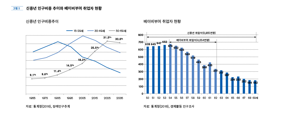 기대수명이 증가하면서 신중년의 노동시장 참여 희망 연령도 증가했으며, 그들은 50세 전후 주된 일자리 퇴직 이후에도 72세까지 소득 또는 보람 있는 노후를 위해 일자리나 일거리를 희망하는 것으로 나타났다. (2016년 통계청 경제활동인구조사 고령자부가조사)