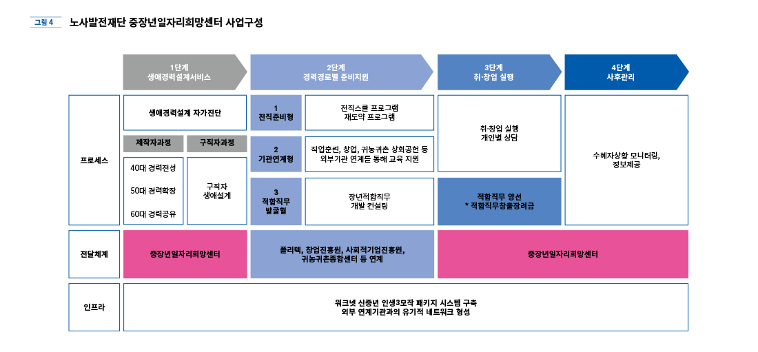 생애경력설계 프로그램에 참여하여 설정한 개인의 경로에 따라 창업 또는 귀농 등이 필요한 경우 각 기관으로 연계, 직업훈련이 필요한 경우 각 직업훈련과정과 연계할 수 있도록 하였고, 특히 폴리텍 신중년 특화캠퍼스를 지정하여 지역기반의 신중년 인력수요에 맞는 맞춤형 훈련을 실시할 수 있도록 하였다. 또한 신중년 적합직무를 개발·확산하고 신중년적합직무에 구직자 고용시 사업주에 지원금을 지급하였다.