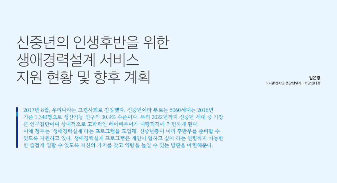 2017년 8월, 우리나라는 고령사회로 진입했다. 신중년이라 부르는 5060세대는 2016년 기준 1,340명으로 생산가능 인구의 30.9% 수준이다. 특히 2022년까지 신중년 세대 중 가장 큰 인구집단이며 상대적으로 고학력인 베이비부머가 대량퇴직에 직면하게 된다. 이에 정부는 ‘생애경력설계’라는 프로그램을 도입해, 신중년층이 미리 후반부를 준비할 수 있도록 지원하고 있다. 생애경력설계 프로그램은 개인이 일하고 싶어 하는 연령까지 가능한 한 즐겁게 일할 수 있도록 자신의 가치를 찾고 역량을 높일 수 있는 발판을 마련해준다.