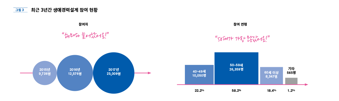 시행 첫해인 2015년에는 9,736명이 생애경력설계프로그램에 참여하였고, 2016년에는 12,576명이, 2017년에는 23,009명이 참여하여 해마다 참여자가 증가하고 있으며, 참여자 연령은 50대가 50% 이상을 차지하고 있다. 또한, 여성참가자가 해마다 늘어나는 추세다.