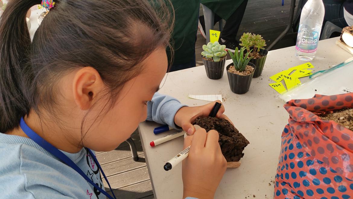 아빠를 따라 여의도에 놀려 왔다가 참여하게 된 어린이는 다육이를 화분에 심고 메시지 판에 ‘김윤솔의 화분’이라고 정성스럽게 쓴다.