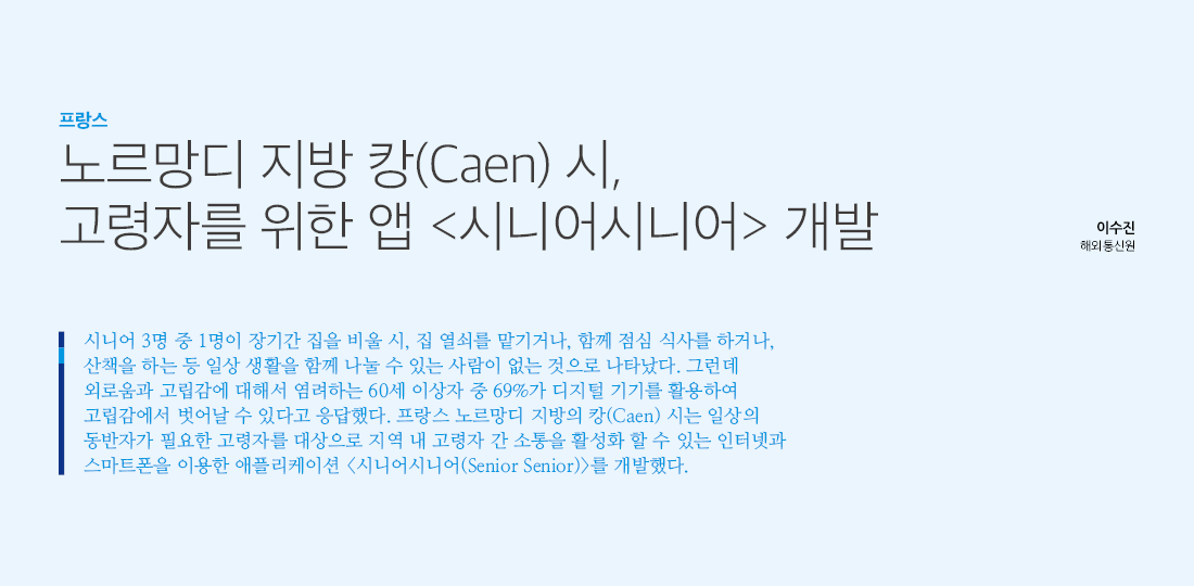 ▶ 프랑스 노르망디 지방의 캉(Caen) 시는 일상의 동반자가 필요한 고령자를 대상으로 지역 내 고령자 간 소통을활성화 할 수 있는 인터넷과 스마트폰을 이용한 애플리케이션 <시니어시니어(Senior Senior)>를 개발함.