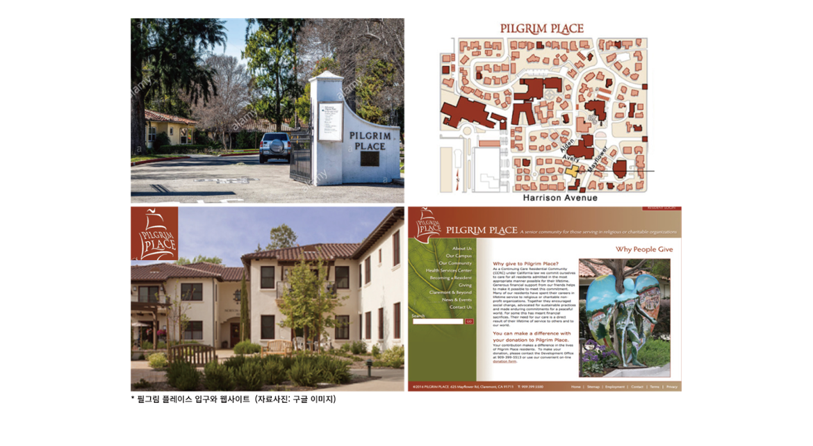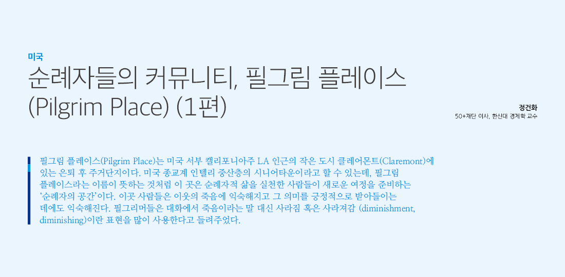 필그림 플레이스(Pilgrim Place)는 미국 서부 캘리포니아주 LA 인근의 작은 도시 클레어몬트(Claremont)에 있는 은퇴 후 주거단지이다. 미국 종교계 인텔리 중산층의 시니어타운이라고 할 수 있는데, 필그림 플레이스라는 이름이 뜻하는 것처럼 이 곳은 순례자적 삶을 실천한 사람들이 새로운 여정을 준비하는 ‘순례자의 공간’이다. 이곳 사람들은 이웃의 죽음에 익숙해지고 그 의미를 긍정적으로 받아들이는 데에도 익숙해진다. 필그리머들은 대화에서 죽음이라는 말 대신 사라짐 혹은 사라져감 (diminishment, diminishing)이란 표현을 많이 사용한다고 들려주었다.