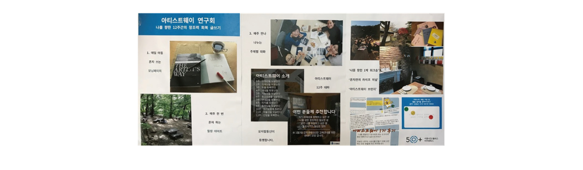 또, 지난여름 중부캠퍼스에는 '나와 함께 하는 아티스트 데이트'라는 이름으로 아티스트웨이 입문과정을 개설했다. 자신에 대한 표현과 대화가 부족한 사람들, 다른 사람 기준에 흔들리며 정체성을 잃어버린 사람에게 꼭 필요한 과정이라는 믿음이 있어서다. 자기 회복이 필요한 엄마들에게도 좋을 것 같아 엄마학교협동조합의 기본 프로그램으로 만들어보려고 구상중이다. 지금도 신청자가 있을 때마다 소규모 그룹을 모집해 진행하고 있다.