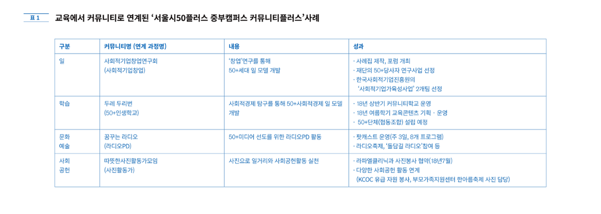 서울시50플러스재단(이하 '재단')에서는 커뮤니티플러스(이하 ‘커뮤니티’) 지원사업을 진행하고 있다. 커뮤니티는 50+세대 5명 이상이 모여 공동의 관심사나 전문성, 취미 등을 토대로 가치 있는 활동을 계획하고 실행하는 모임이다. 커뮤니티에 참석하는 50+세대는 퇴직 후 동료와 함께 의미있는 활동을 시작해 보고 조금은 다른 삶에 용기를 더하는 계기를 마련하게 한다. 재단의 커뮤니티 중 약 51%는 캠퍼스 교육과정을 통해 결성되는데, 이로인해 상상할 수 없는 활동들이 커뮤니티를 통해 기록되고 공유되는 것들을 보게된다.