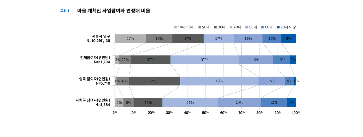 지난 6년간 마을정책 주요 참여자군은 아래 표에서 보는 바와 같이 10대부터 70대까지 다양한 연령층이 참여하고 있다. 이중 3,40대 참여자 비중이 높은 것은 마을 공동체 활동이 육아기와 학령기 자녀를 가진 부모의 참여비중이 매우 높기 때문이다. 이 세대가 아이들을 잘 키우기 위한 다양한 지역사회 여건을 만드는 활동으로 공동체의 필요를 인식하기 시작했다면, 5,60대의 마을공동체 참여는 동네에 대한 관심,이웃 돌봄, 봉사활동등 지역구성원으로 사회적 역할이 자연스럽게 옮겨가는 모양새를 띤다. 최근 동단위 ’마을계획단‘을 구성하여 2년간 집중적으로 동네의제를 발굴해서 직접 해결해가는 활동을 해 낸 동(洞)의 주민참여자군을 보면 50대~70대가 40% 가까이 된다.