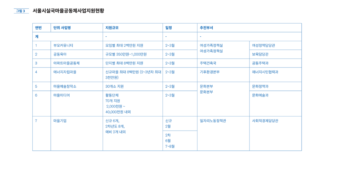 위와 같은 목표를 실현하기 위한 정책지원 구조는 '주민3인 이상이 모여 활동계획을 세우고 정책적 지원을 신청하는 것'이 중심골격이며 이를 지원하기 위한 자치구 중심의 지원체계와 서울시 국.실별 마을공동체지원사업이 추진되고 있다.