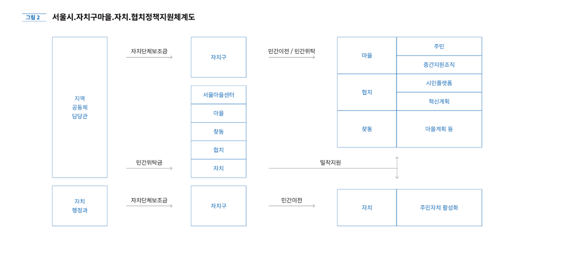 서울시의 마을공동체정책은 첫해에 지원조례, 민관협의기구, 기본계획, 담당 부서, 중간지원조직 등 추진기반을 만들어 시행되었다. 이후 2013년부터는 서울시 여러 실.국의 마을공동체지원사업을 정비해서 통합적인 사업체계를 구축했다. 민간에서는 마을공동체 활동 주체들이 자치구별로 모이는 마을네트워크(마을넷)를 만들었고, 2014년부터는 자치구 중간지원조직 설립을 지원해서 마을공동체 정책이 자치구 주도로 추진될 수 있는 여건을 조성했다.