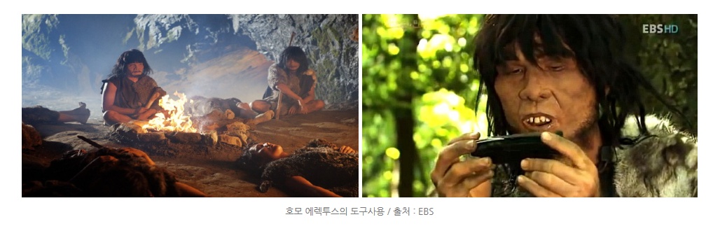 700백만년 전 침팬지와 달라지기 시작하면서 도구를 사용하고 150만년 전쯤 호모 에렉투스는 불을 사용하기 시작한다. 이것이 결정적으로 인구 증가로 이어진다. 150만년 전 불을 발견했으나 불을 피우는 기술은 50만년이 되어야 생겼다. 그 전엔 산불만 기다린 것. 전세계 퍼지는데 20만년이 걸렸다. 불을 피울 수 있게 되면서 인류는 추운 데로 이사 간다. 벌레가 적은 곳으로. 또 불 주변에서 많은 이야기를 나누게 되면서 불은 지혜를 전수하는 공간을 만들게 된다. 옛날엔 쓰지 못했던 시간을 쓰게 된다. 참고로, 침팬지는 하루 종일 씹는데 시간을 다 보낸다.