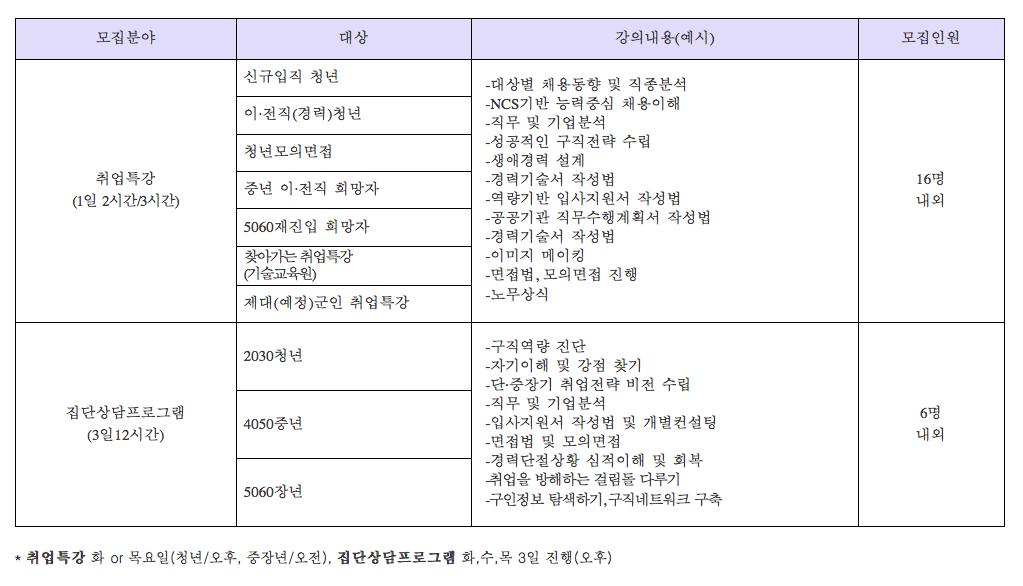 모집 분야는 취업 특강과 집단 상담 프로그램으로 나뉘며, 서울일자리센터는 이번에 선발한 인력풀을 대상으로 2019년 2월~12월에 강의 의뢰를 하게 됩니다.