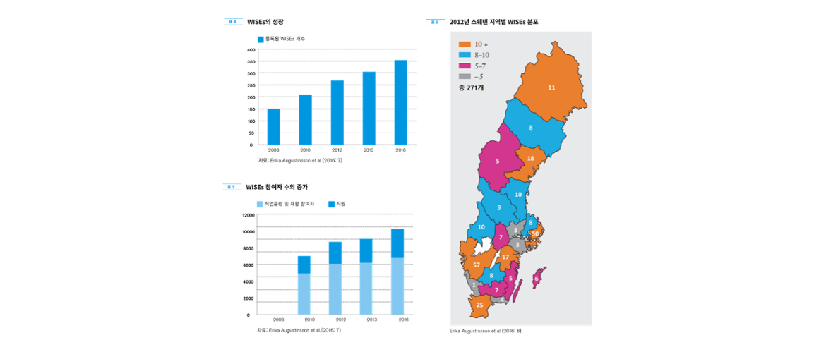 아래 <표 4>와 <표 5>는 소피잠(Sofisam)에서 발표한 통계로, WISEs의 수는 꾸준히 증가하여 2016년에 약 350여 개를 기록하였다. 또한, WISEs에 참여하고 있는 인구는 2016년 기준, 총 10,195명이고 그중 3,480명이 고용된 직원인 것으로 나타났다(Erika Augustinsson et al., 2016: 7). <표 6>은 경제 및 지역발전을 위한 공공기관인 틸벡스트베르켓(Tillväxtverket)에서 발표한 2012년 WISEs의 지역별 분포를 보여준다(Erika Augustinsson et al., 2016: 8). WISEs의 규모는 고용된 직원과 프로그램 참여자를 합쳐 10~30명의 인원을 가지는 경우가 대부분이다(Tillväxtverket. 2013: 4).