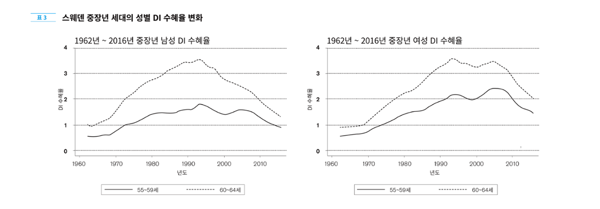 그동안 스웨덴 정부는 중장년 세대가 노동시장에서 조기에 이탈하는 것을 막고 가능한 한 오래 사회 활동을 하도록 유인하기 위하여 (주로 연금 정책과 관련된) 고용 정책에 여러 변화를 주었다. 그중 하나는 장애연금(disability pension 혹은 sickness compensation)과 관련한 장애보험(disability insurance, DI)의 수혜 자격 기준을 엄격하게 한 것이다. 2003년도에는 DI 수당 수혜 자격을 5년마다 재검토하도록 개정되었고, 2008년에는 DI 수당을 신청하기 위해서는 근로 능력이 영구 상실됐음을 증명하도록 개정되었다). 실제로 개정 이후 DI 수당 수여 인구 비율이 급격히 줄어든 것으로 보고되었다(Laun et al., 2017: 28). 아래 <표 3>은 1962년에서 2016년까지 55~64세 중장년 세대의 성별 DI 수혜율 변화를 보여준다.