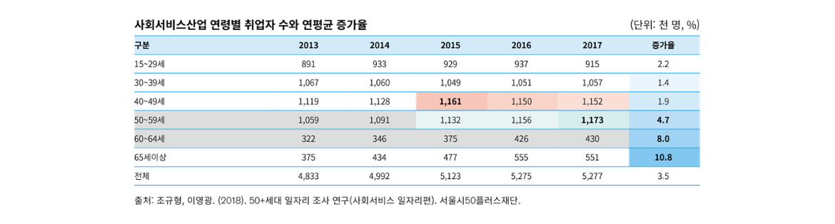 넓은 분야만큼이나 사회서비스 분야의 취업자는 매년 증가하고 있는데, 특히 50+세대의 비중이 빠르게 증가하고 있다. 취업자의 연령별 증가 추이를 보면 2015년까지 40대 비율이 가장 높았고 2016년 이후에는 50대가 가장 높은 비율을 보이고 있다. 최근 10년간 사회서비스산업 취업자 증가율 통계를 보면 50대와 60대가 가장 높다.