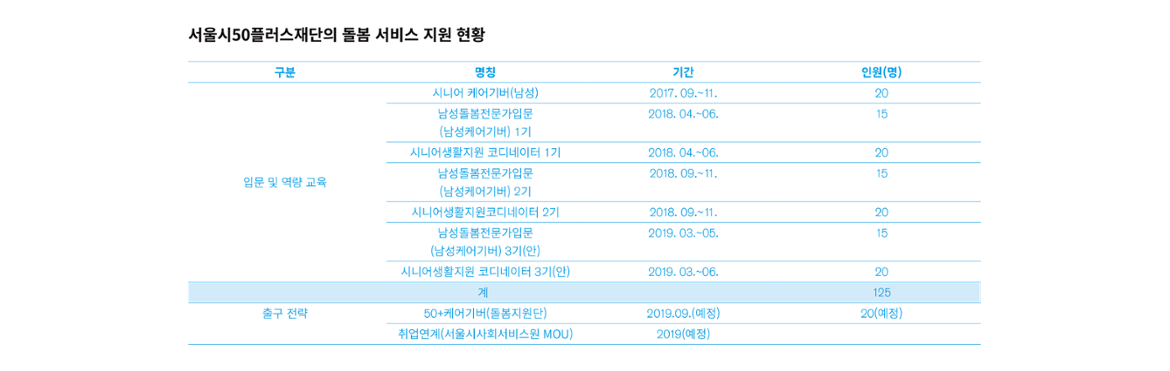 노동이 가치를 평가받는 것에 전문성이 필요하듯, 돌봄 서비스가 가치를 인정받고 발전하기 위해서는 전문성 및 역량 향상 지원이 필수적이다. 특히 돌봄 서비스 분야에서 절대적으로 부족한 남성 종사자 양성은 더욱 필요하다. 서울시50플러스재단은 사회서비스 분야에서 민간기관이 수행하기 어려운 교육과 기관간 협력을 위해 시니어비즈니스 남성돌봄전문가 과정, 더하기포럼 등을 지원하고 남성케어기버 과정과 커뮤니티를 통해 사회서비스 입문은 물론 종사자 간 지속적인 연계·협력을 통해 역량을 향상할 수 있도록 지원하고 있으며, 앞으로 이런 지원을 더욱 확대할 계획이다.