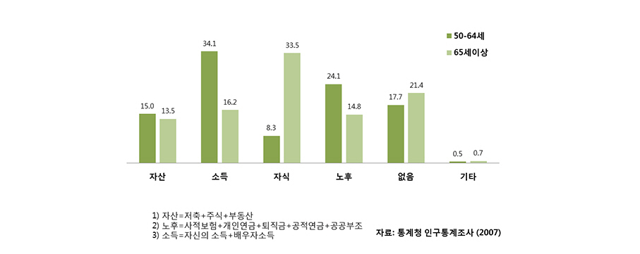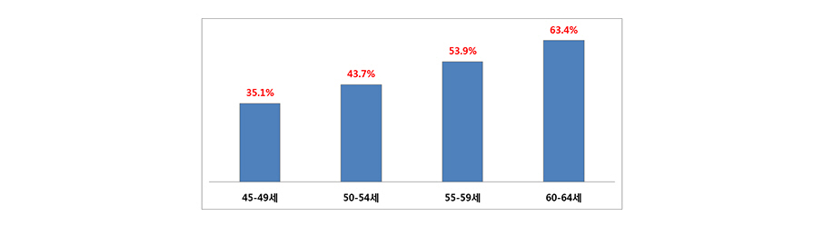 2) 연구내용은 제2차 고령화패널 기본조사 8,688명의 자료를 분석한 내용에 근거한다. 고령화연구패널조사는 한국노동연구원이 2006년 과 2007년 2차례 기본조사를 실시하였다. 당시 45세부터 64세까지의 중장년층 통계자료이므로, 지금 55세부터 74세에 해당된다.