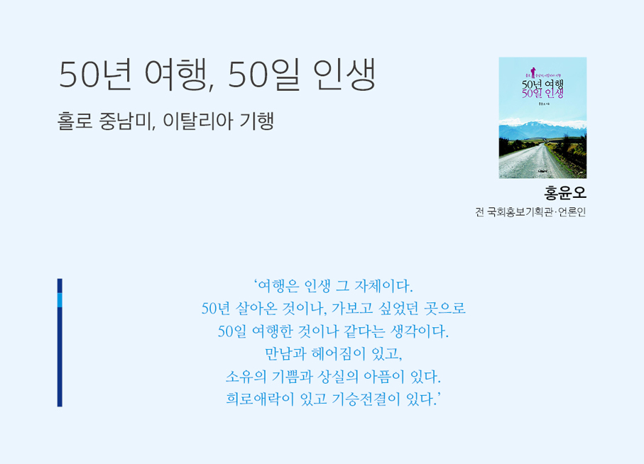 누구나 할 수 있는 여행, 그러나 막상 하려고 하면 쉽지 않은 여행 이야기를 풀어놓은 책이 있다. 한국 최초의 아프가니스탄 종군기자로, <아프간 블루스>의 저자이기도 한 홍윤오 씨가 재작년에 펴낸 <50년 여행 50일 인생>(나눔사 펴냄)이 그것이다. 우연인지 필연인지 책 제목이 50+재단과 딱 들어맞는다. 주인공 나이도 그렇다. 저자는 말한다.