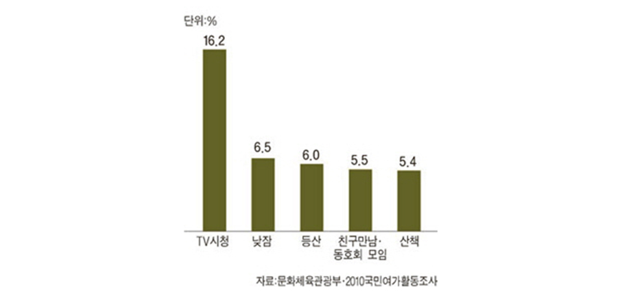 한국인들은 전반적으로 취미여가 활동이 부진하다. 특히 은퇴자들에게 취미를 물어보면 대부분 등산이라고 말한다. 마음만 먹으면 언제든지 쉽게 할 수 있고, 돈도 별로 안 들어간다는 장점 때문이다. 등산을 하지 않는 사람은, 집 근처를 산책하는 게 고작이다. 등산이나 산책을 마치고 집에 돌아와서는 TV를 보면서 하루를 보낸다(문화체육관광부 국민여가활동조사, 베이비부머여가활동 조사 참조). 다람쥐 쳇바퀴 도는 듯한 단조로운 생활이다.