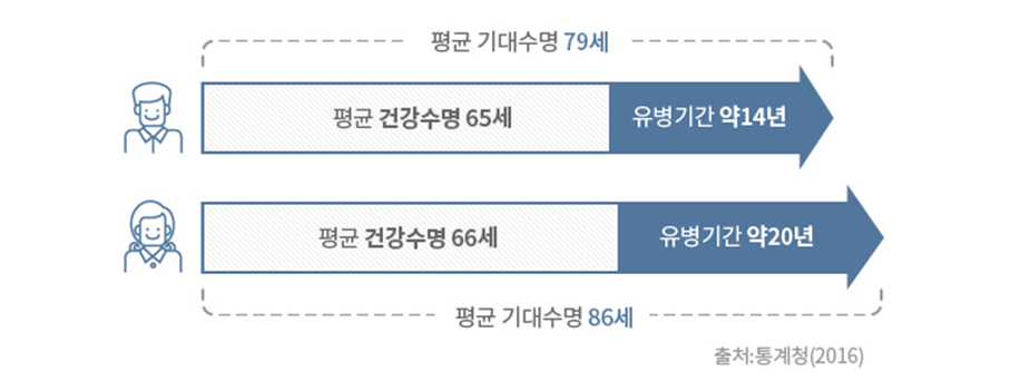 WHO 보고서에 따르면, 한국인의 평균수명은 82.1세(2015년 기준), 건강수명은 73.2세이다. 건강수명이 평균수명보다 9년 더 작은 것이다. 한국인의 삶이 앞으로 건강해지려면 평균수명과 건강수명 간의 격차가 줄어들어야 하는데, 이 격차가 예나 지금이나 별로 줄어들지 않고 있다. 통계청은 유병(有病) 기간을 기준으로 하여, 2015년 한국인의 건강수명은 남자 65세, 여자는 66세라는 조사결과를 발표한 바도 있다. 대부분의 한국인들이 사망하기 전, 14~20년간을 병석에 누워 지낸다는 것이다. WHO는 한국인의 건강한 삶을 위협하는 대표적인 질병으로 5가지를 꼽고, 이에 대한 예방 활동을 주문하고 있다. 그 다섯 질환은 ①우울증·불안증 등 정신질환, ② 척추디스크·관절염 등 근골격계(筋骨格系) 질환, ③당뇨병, ④협심증‧심근경색증 등 심혈관(心血管) 질환, ⑤폐렴·감기 같은 전염성질환 등이다.
