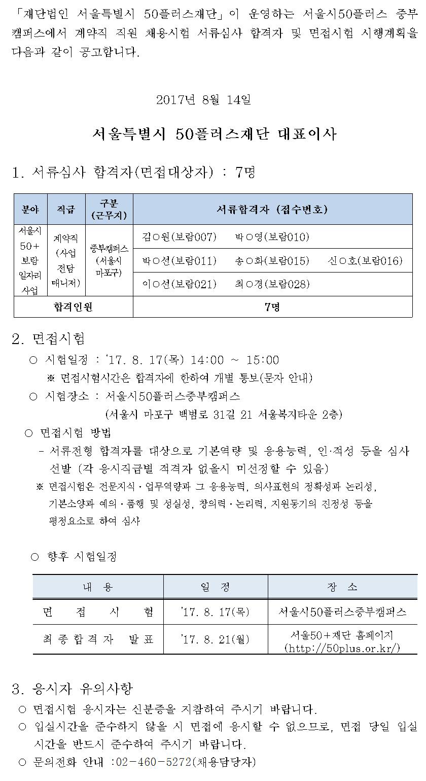 [재단]계약직원 채용 서류심사 합격자 및 면접시험 시행 계획 공고
