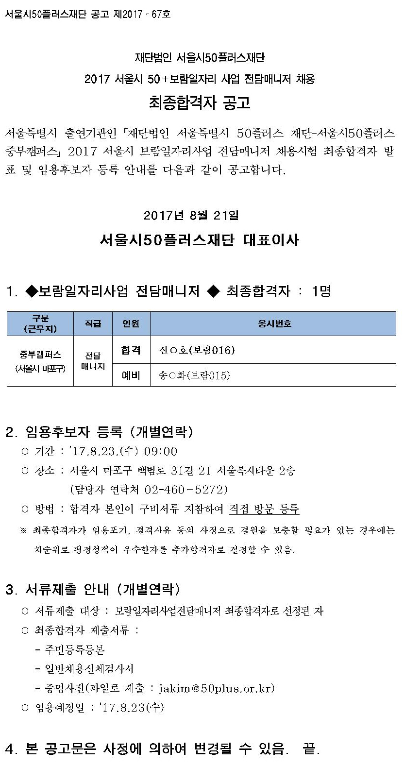 [재단]2017 서울시 50+보람일자리 사업 전담매니저 채용 최종합격자 공고