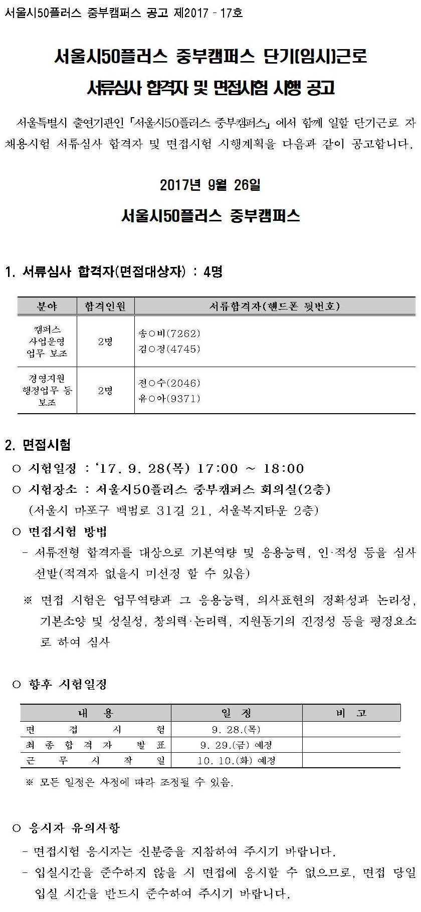 [재단][중부] 단기(임시)근로 서류심사 합격자 및 면접시험 시행 공고