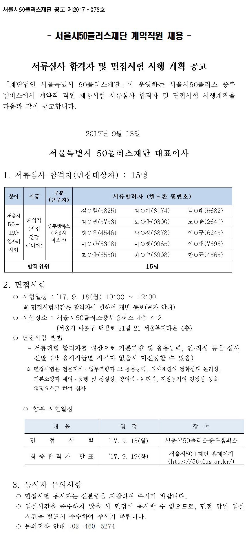 [재단]계약직원 채용 서류심사 합격자 및 면접시험 시행 계획 공고