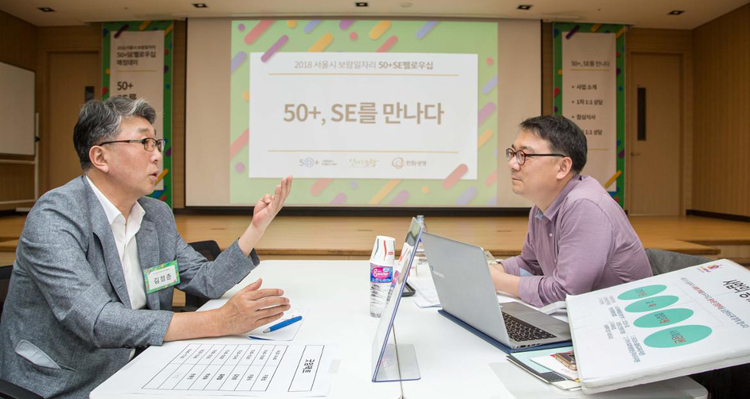 사업 진행하면서 지켜본 결과 그건 확실히 말씀드릴 수 있어요. 어느 정도 인내의 시간이 지나고 나면 양측 모두가 서로를 믿고 의지할 수 있는 최고의 파트너가 될 수 있어요. 처음에는 50+세대가 낯선 곳에서 역량을 발휘할 수 있을까 반신반의했던 고용주나 동료들도 결국엔 50+세대의 책임감과 연륜에서 나오는 안정감에 매료되시더라고요. 상대적으로 열악한 근무 환경에 힘들어하던 50+세대분들은 오히려 그렇기 때문에 본인의 경험과 역량이 가치 있게 활용될 수 있다는 점을 알고 더 큰 만족감을 느끼시게 될 거예요. 두고 보세요.(웃음)