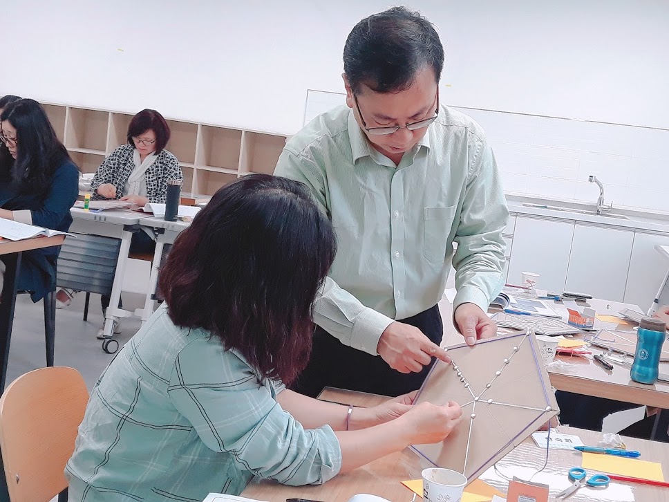 오리고 붙이며 식물의 잎차례 모양을 만들어 가는 진지한 모습의 수강생들