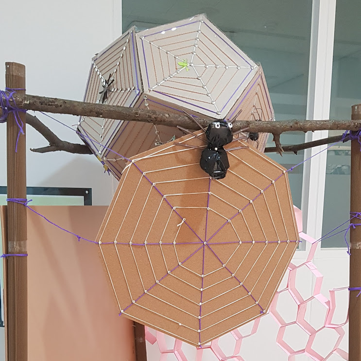 판지에 핀을 박고 끈으로 돌려가며 방사형 거미집을 만들어 봅니다.