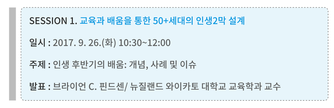 두 번째, 후반기의 배움은 개인적 만족을 위해서 필요하기도 하다. 배움 그 자체로도 충분히 가치 있는 일이라는 생각을 공유하고 개인적인 성장을 목표로 한다. 아이디어가 풍부하고 회복력이 강한 중고령자가 되기 위한 배움을 계속해야 한다.