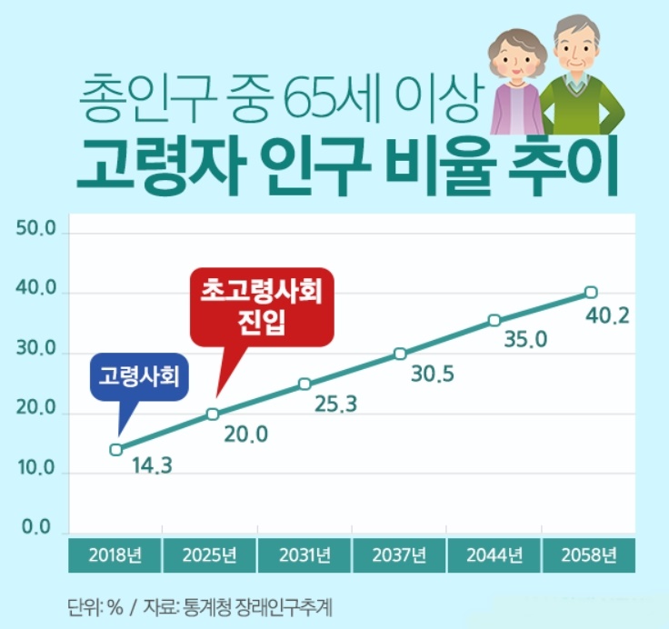 총인구 중에 65세 이상의 인구가 총인구 대비 비율이 7% 이상이면 고령화 사회(Aging Society), 14% 이상이면 고령사회(Aged Society), 21% 이상이면 초고령사회라고 한다. 우리나라 65세 인구 비율이 지난 2000년 7.2%로 고령화 사회에 진입하였고, 2018년에는 14.3%, 2026년에는 20.8%로 초고령화 사회에 진입할 것으로 예상되고 있다.