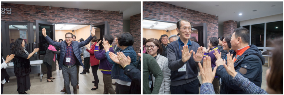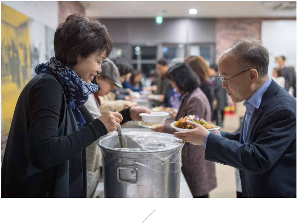 벌써 밖이 깜깜해졌습니다. 50+인생학교의 전통이죠! 선배들의 뜨거운 박수와 함께 후배들을 위해 직접 준비한 저녁식사를 맛있게 먹고요~